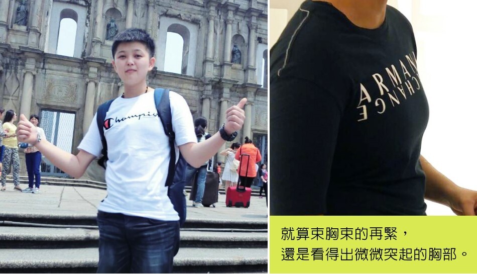 從小我就發現自己跟一般女孩不一樣,討厭穿裙子,個性也不溫柔反而還有點man,在長輩及師長眼中都覺得我就像個小男孩一樣。隨著青春期的到來,第二性徵發育—-胸部漸漸變大,讓我相當的困擾,因為擔心父母不能接受我的不一樣,所以一直很壓抑著自己,也不知道該向誰詢問這尷尬的問題,所以都只能使用「束胸」,來掩飾我的胸部。