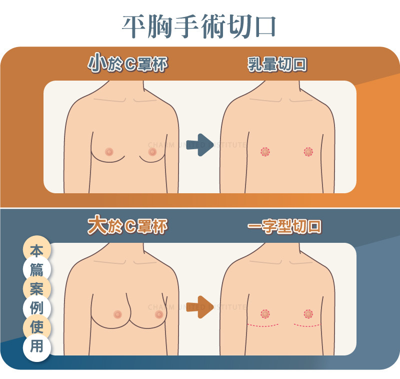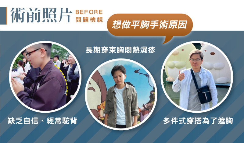 由於平胸手術除了疤痕所帶來的問題外,對於未來性也是非常重要的。因為這是一個不可逆的手術。女性會面臨到將來胸部無法生長及無法哺乳的問題,所以在手術前醫師是非常需要了解客戶,是否意志堅定及家人是否支持等。