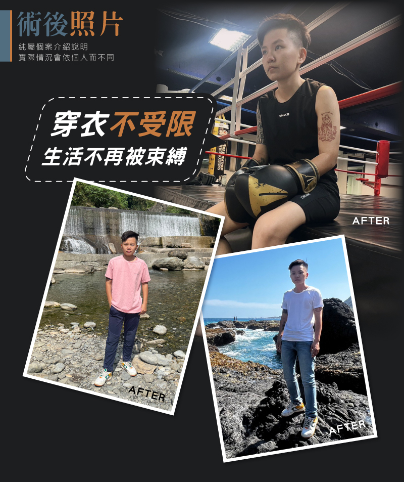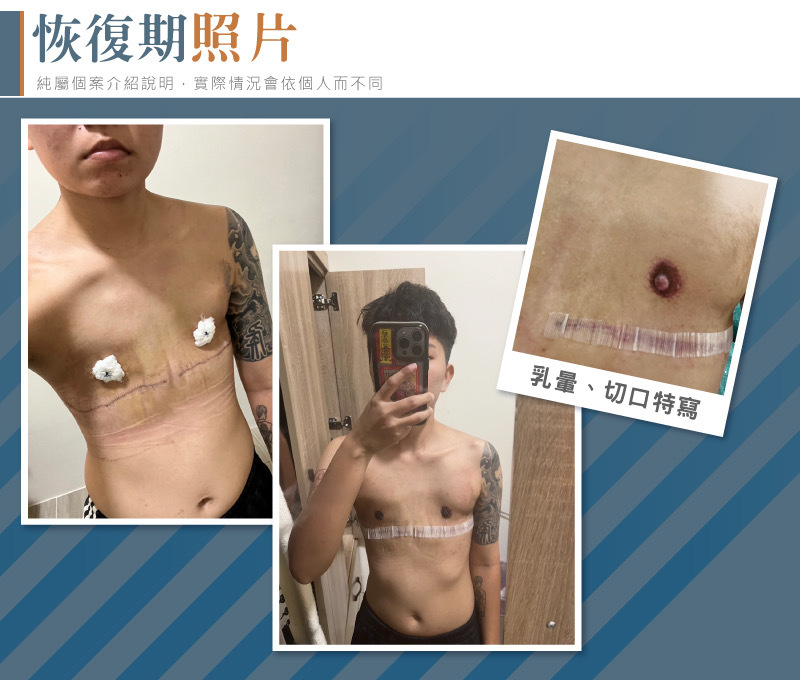 平胸手術後在照護上並不複雜,只是前期仍需要穿戴束胸衣來穩定傷口、組織以及血水,當然也要配合醫囑,減少術後感染的風險。從手術前的期待到拆線時的雀躍,真的做到了”擺脫束胸,勇敢做自己“不僅是生活上帶了的轉變,對於自己也更加自信及認可。